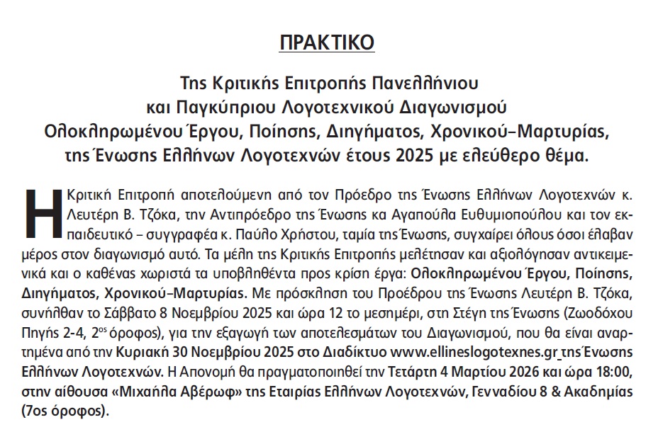 Της Κριτικής Επιτροπής Πανελλήνιου και Παγκύπριου Λογοτεχνικού Διαγωνισμού Ολοκληρωμένου Έργου, Ποίησης, Διηγήματος, Χρονικού-Μαρτυρίας, της Ένωσης Ελλήνων Λογοτεχνών έτους 2024, με θέμα: